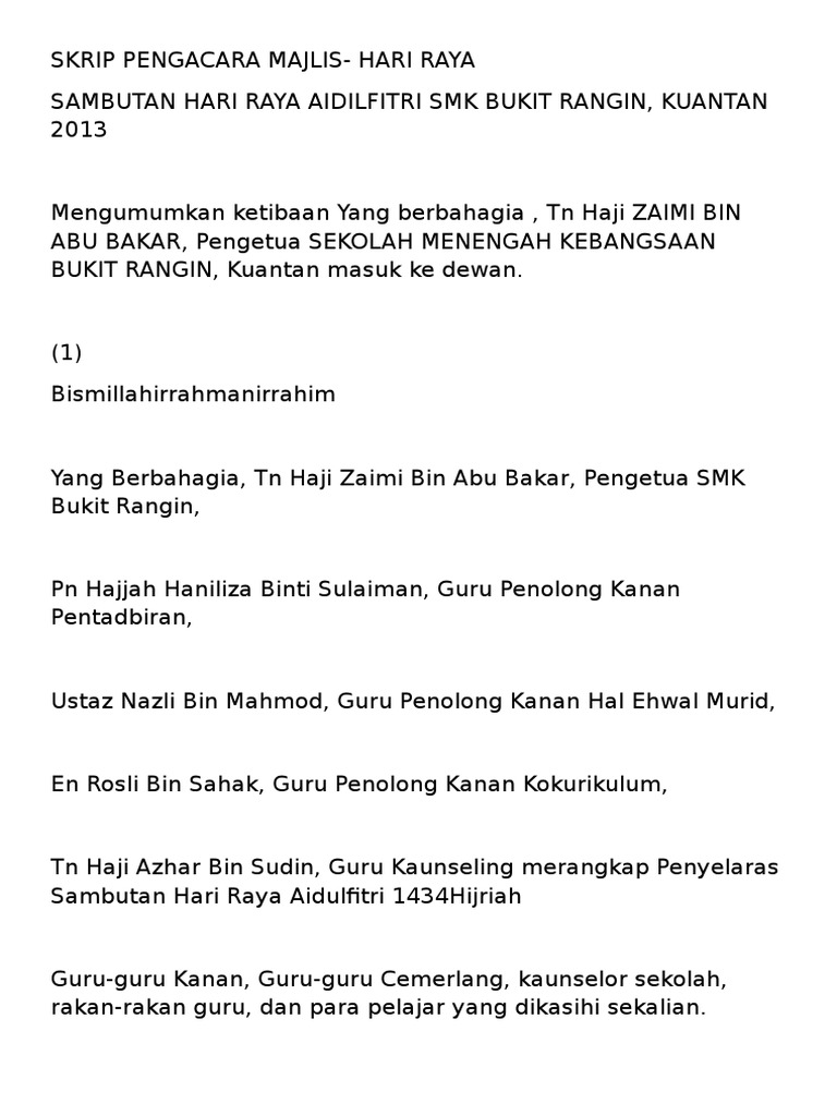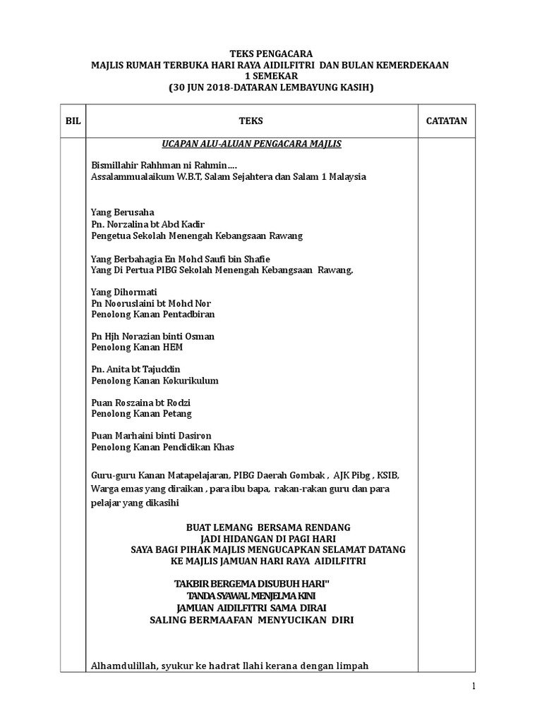 Teks Pengacara Majlis Rumah Terbuka Aidilfitri 1 Semekar 300618 Pdf